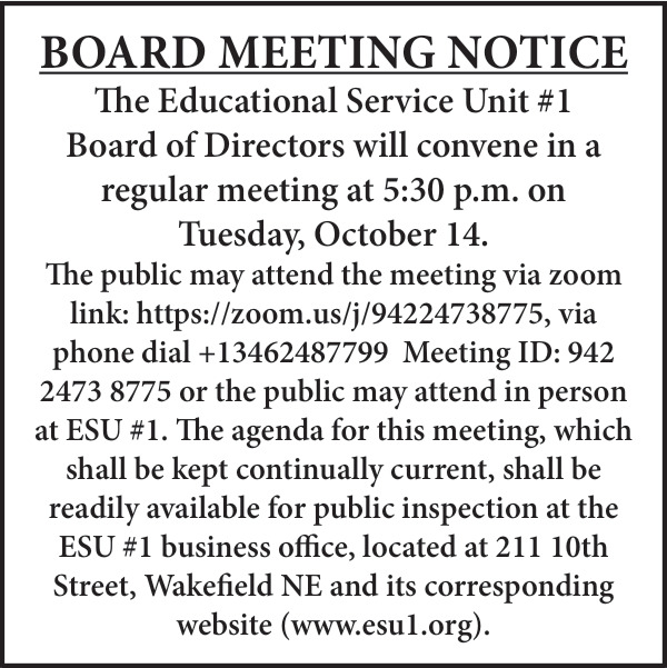 Oct 07, 2025. Educational Service Unit 1 Notice Ads from The Wayne Herald