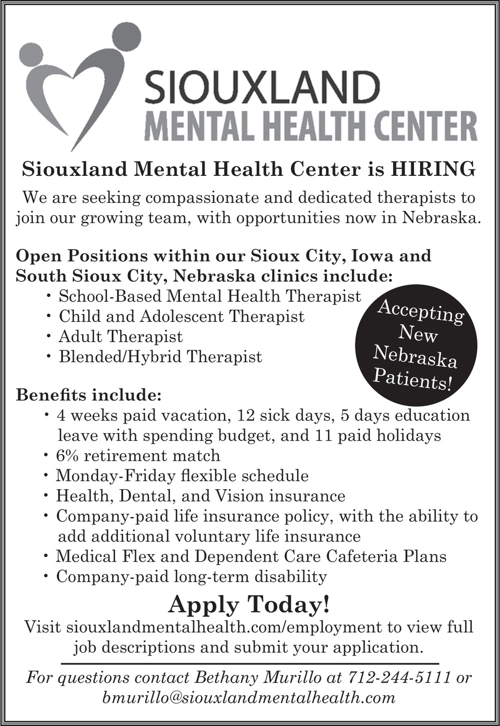 Oct 07, 2025. Siouxland Mental Health Center Jobs Ads from The Wayne Herald