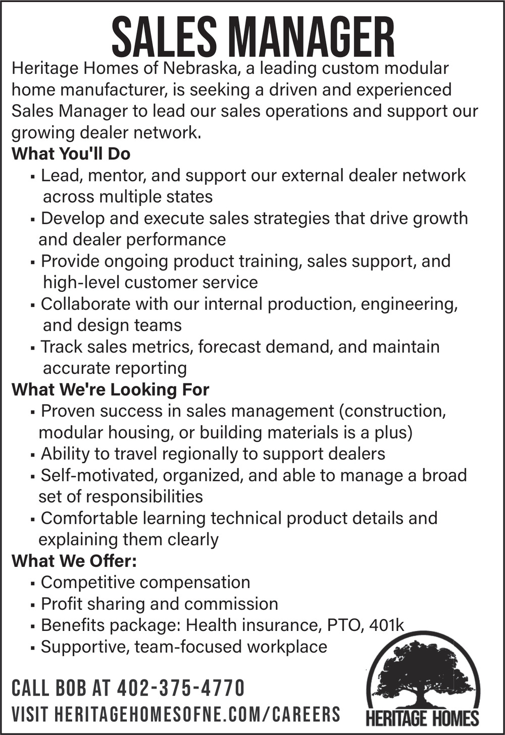 Nov 25, 2025. Heritage Homes of Nebraska Inc Jobs Ads from The Wayne Herald