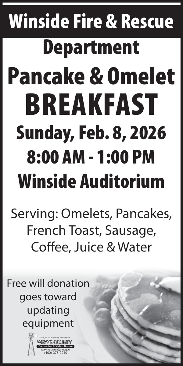 Jan 14, 2026. Winside Fire & Rescue Department - Pancake Breakfast (Feb. 8, 2026) Event Ads from The Wayne Herald