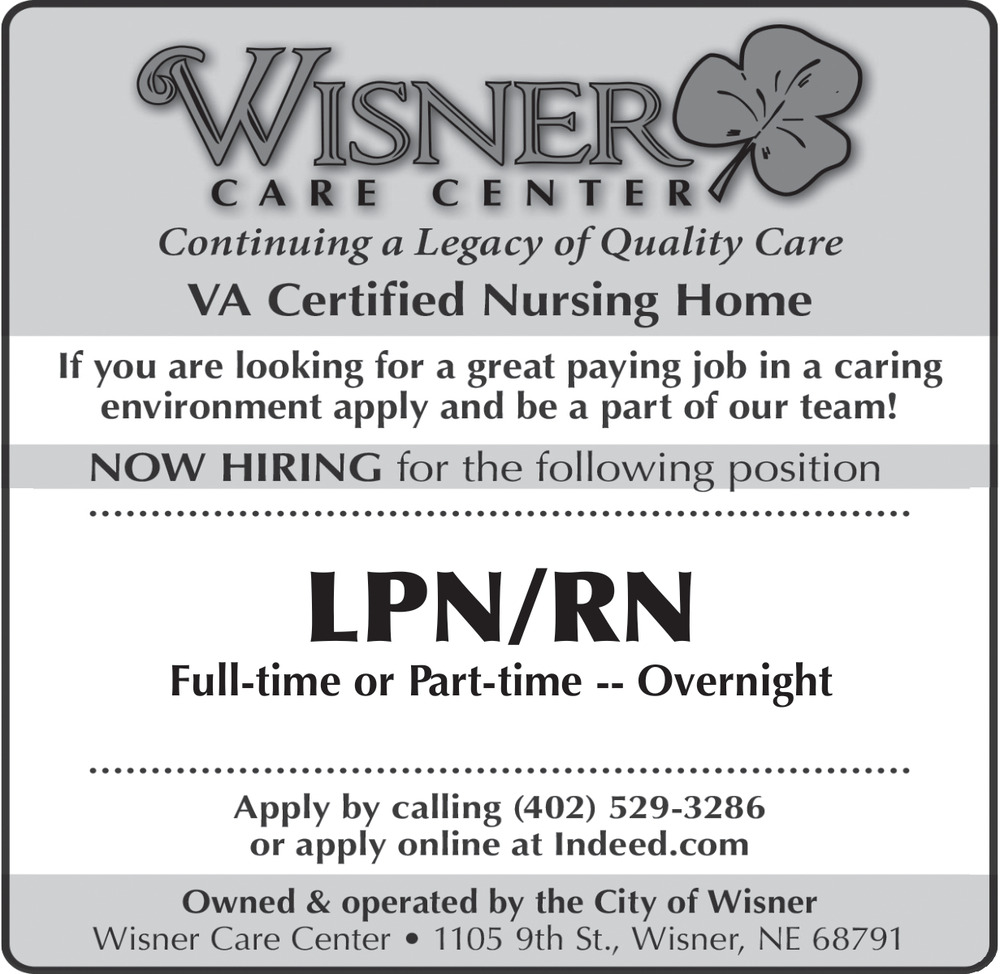 Feb 10, 2026. Wisner Care Center Jobs Ads from The Wayne Herald