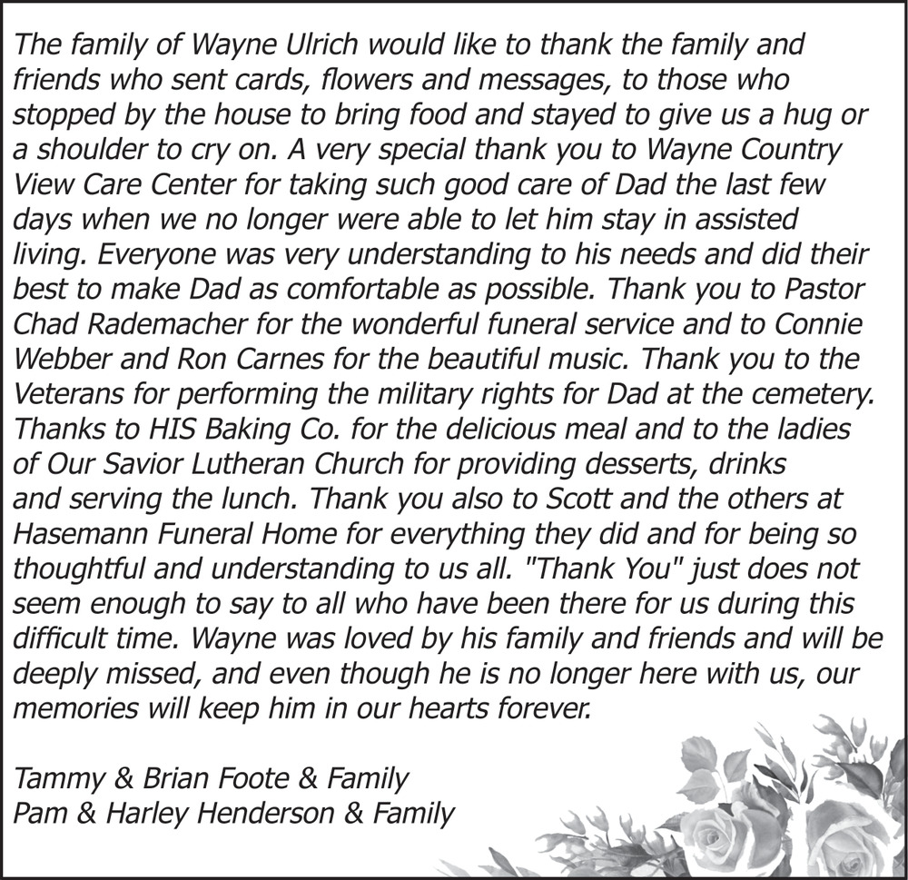 Feb 25, 2026. Wayne Ulrich Obituaries Ads from The Wayne Herald
