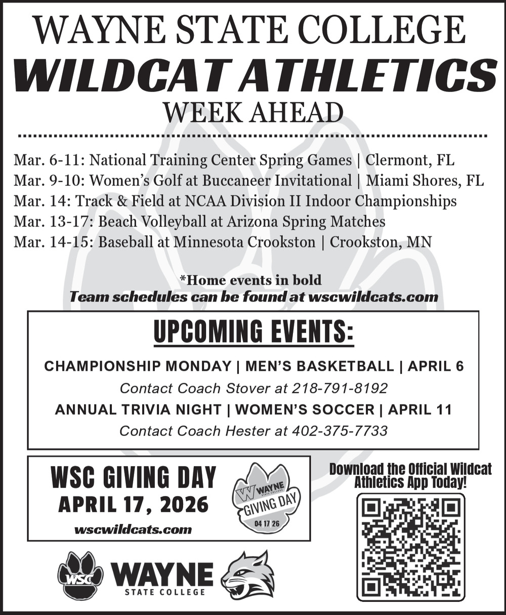 Mar 10, 2026. Wayne State College Wildcats Sporting Events Ads from The Wayne Herald
