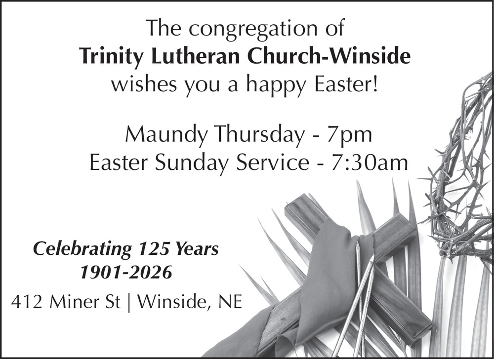 Mar 31, 2026. Trinity Lutheran Church - Winside Church Ads from The Wayne Herald