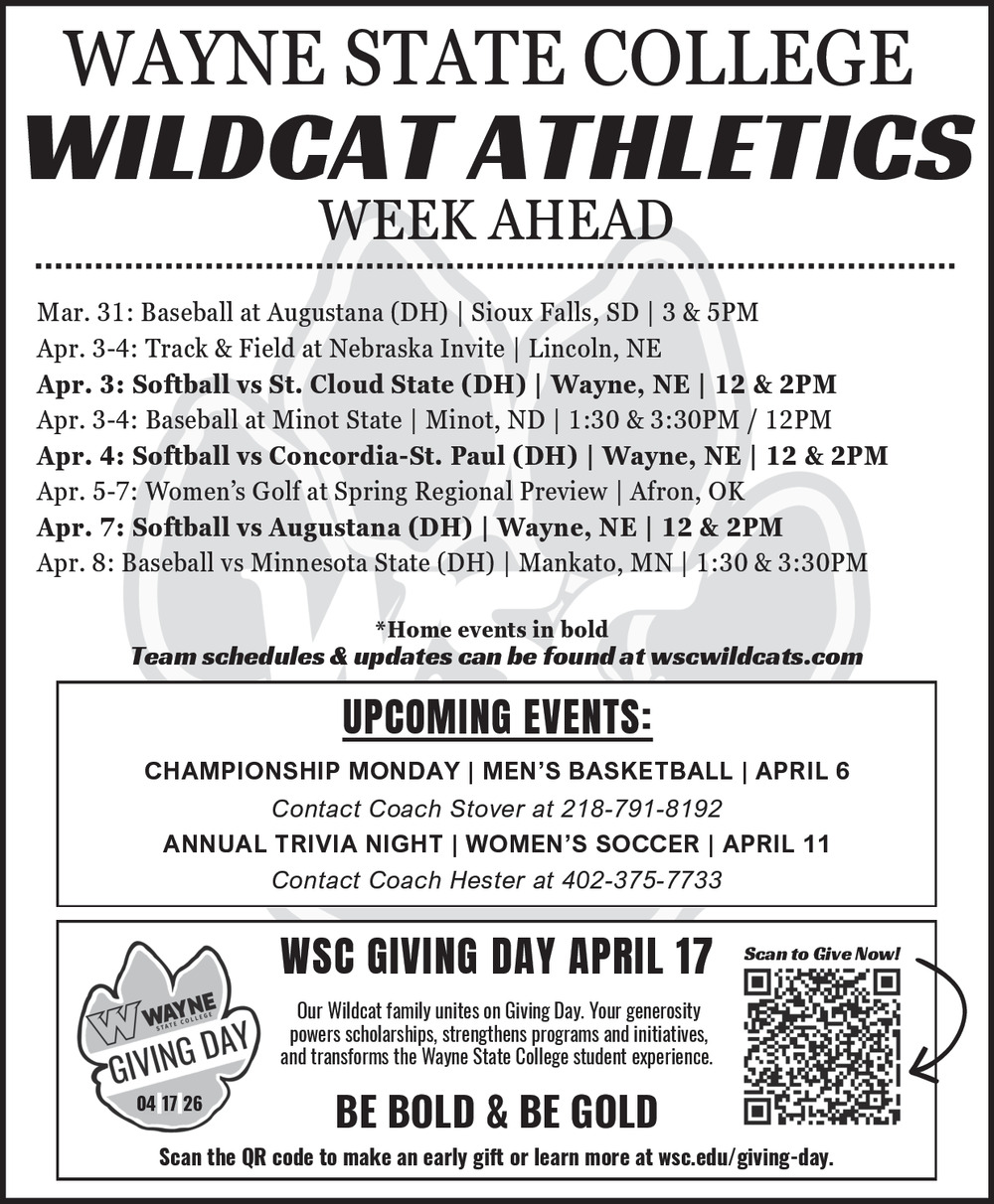 Mar 31, 2026. Wayne State College Wildcats Sporting Events Ads from The Wayne Herald