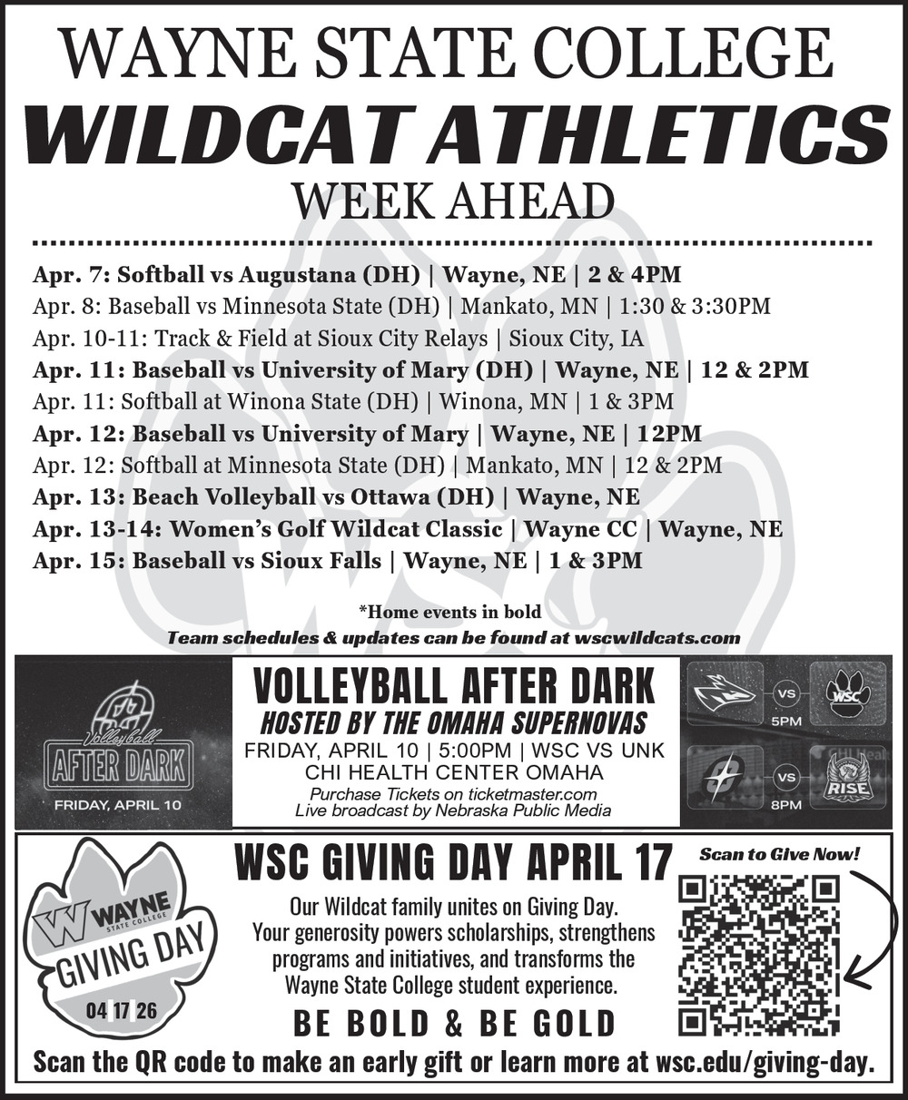 Apr 07, 2026. Wayne State College Wildcats Sporting Events Ads from The Wayne Herald
