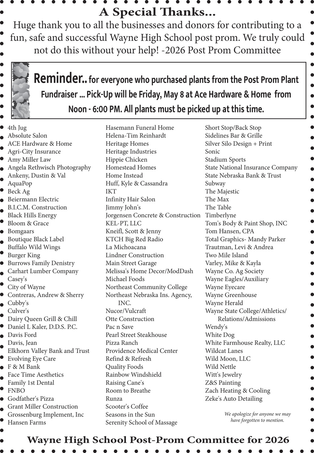 Apr 28, 2026. Wayne High School Misc Ads from The Wayne Herald